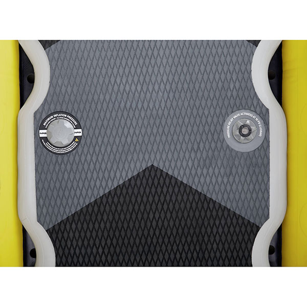 - La construction à points tombants de 4 po d'épaisseur du pont se gonfle à 10 psi, créant une surface de travail super rigide, et de multiples trous de drainage évacuent l'eau rapidement.