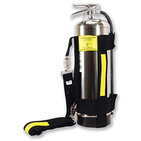 Le dernier cri en matière de harnais d'extincteur (en cannette). Maintenu en place par deux sangles velcro de 3 pouces. Chaque sangle possède une puissance de maintien de 2700 lb. Une sangle de sécurité avec anneau en « D » monte à travers le support de suspension que l'on trouve sur toutes les canettes. Si, pour une raison quelconque, les sangles de maintien sont déchirées, la sangle de sécurité empêche la boîte de tomber. Comme vous pouvez le voir, le harnais peut aussi être porté horizontalement dans une main par la sangle verticale centrale. Peut être utilisé sur tous les types d'extincteurs.