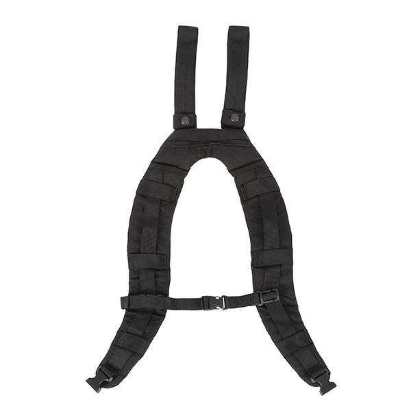 Harnais de style H possédant des boucles de charges à la poitrine pour transporter un système d'hydratation ainsi qu'une courroie au sternum afin de stabiliser le poids.