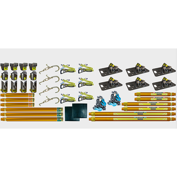 Avec 6 sangles à cliquet et une base articulée de 30 cm (12 po) avec anneau d'ancrage, vous pouvez attacher deux sangles à chaque base, ce qui donne un deuxième triangle de stabilité reliant la base de la jambe de force à la charge. Deux chaînes de qualité 100 20 pi (6,1 m) 3/8 po sont aussi incluses dans la trousse pour connecter les supports aux véhicules industriels et commerciaux lourds. 4 crochets en ''J'' sont fournis pour vous permettre de trouver des points d'attaches solides.
