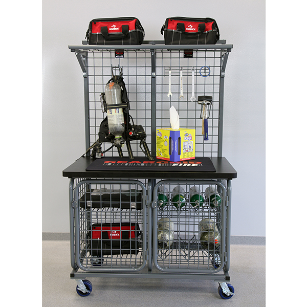 Le poste de travail modulaire comprend une surface de travail robuste, ainsi qu'une capacité d'entreposage sécurisée et un accès pratique et facile aux bonbonnes SCBA et O2. Les unités individuelles se transportent facilement à travers les halls et les portes, ce qui permet d'amener le poste de travail à l'équipement pour un chargement/déchargement plus sûr et plus facile. Des étagères interchangeables, réglables et plates pour les outils et les fournitures sont également disponibles.