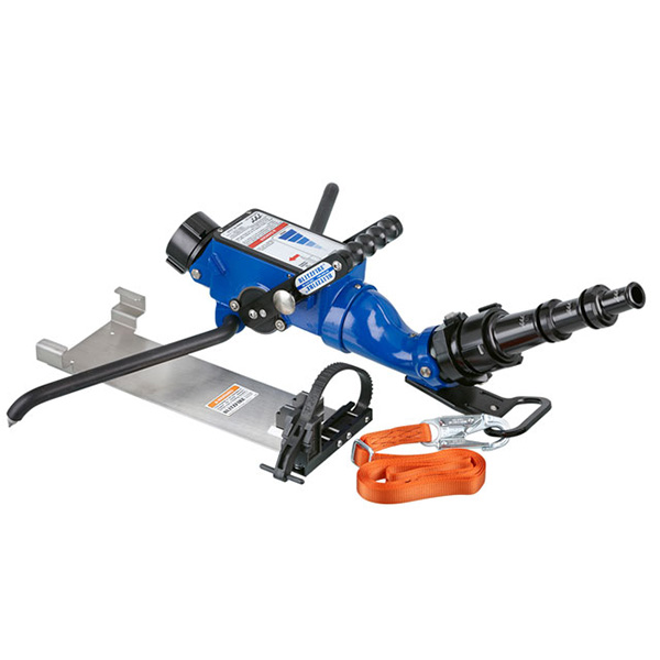 Flow range up to 500 gpm (2000 l/min). The monitor features low friction inlet and outlet pivots. Outlet has built-in stream shaper. Elevation is manually adjustable between 10 and 46 degrees above horizontal. Horizontal rotation is manually adjustable 20 degrees either side of center. The SAFETY SHUT-OFF VALVE will shut off flow if monitor slides or lifts. It has six detent flow positions with a patented turbulence free slide valve for operator flow control. When the legs are folded, the carbide tips point up for carrying safety. The heavy-duty carbide tipped legs are easily folded out to a wide deployed stance. Stowed in storage bracket overall size is 29.5″L x 8.1″W x 8.5″H (74.9 x 20.6 x 21.6 cm). Standard inlet is 2.5″ (65mm) rocker lug swivel coupling. Standard outlet is 2.5″ (65mm) rigid male threads.