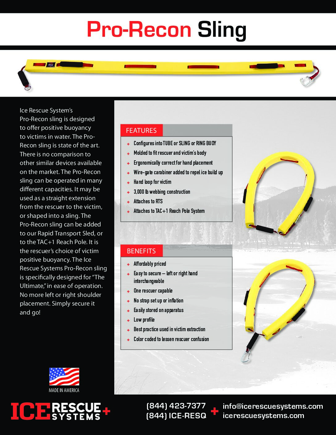 The Pro-Recon Sling is state of the art. There is no comparison to other similar devices available on the market. The Standard Water Rescue Sling can be operated in many different capacities. It may be used as a straight extension from the rescuer to the victim, or shaped into a sling. The Standard Water Sling can be added to our Rapid Transport Sled, or to the 9-1-1 reach pole. It is the rescuer’s choice of victim positive buoyancy. The Ice Rescue Systems Pro-Recon Water Rescue Sling is specifically designed for “The Ultimate,” in ease of operation. No more left or right shoulder placement. Simply secure it and go!