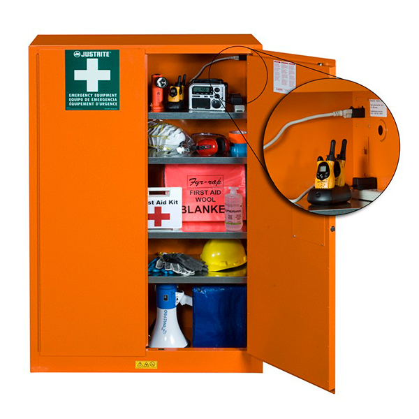 For protected, quick access to emergency supplies during a disaster, this high performance cabinet features a fire-resistant design with durable powder paint “emergency orange” finish for high visibility. It can be located quickly during power outages with the GloAlert™ glow-in-the-dark labels. Spacious design includes four adjustable shelves providing storage for flashlights, radios, respirators, first aid items, and much more.