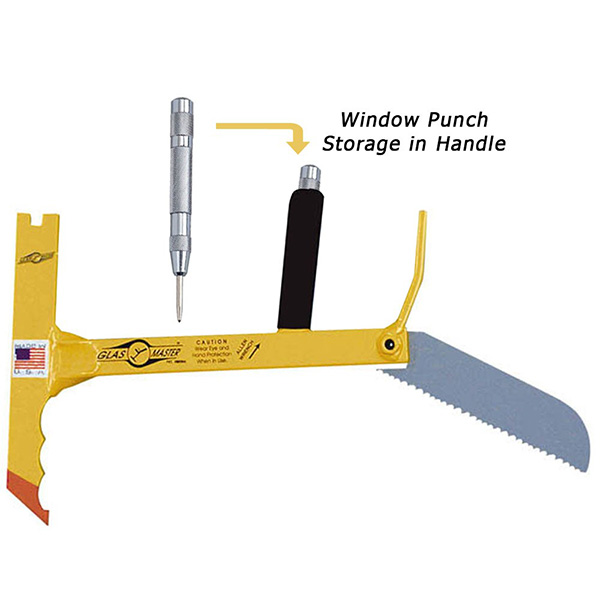 The storage of the spring loaded center punch in the Glas-Master has also proven to be an advantage. In the past, the window punch was frequently lost or misplaced and not immediately available when needed.
