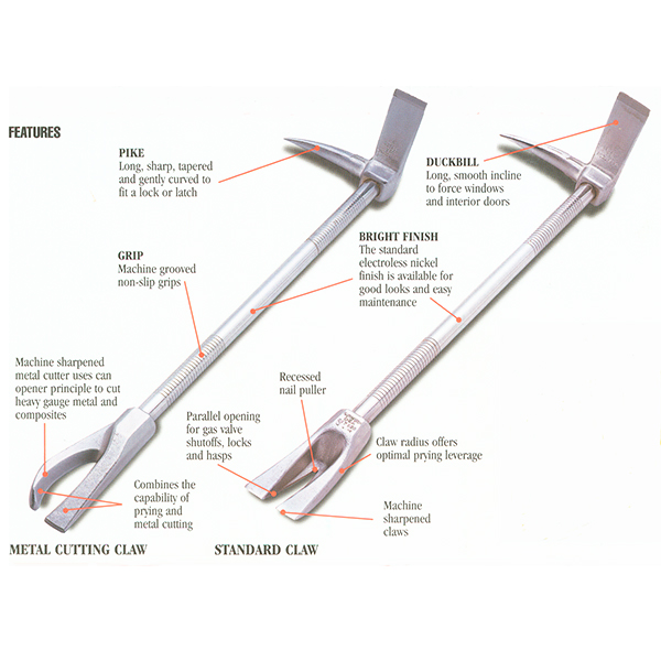 Both the head and claw are forged from high alloy steel, heat treated for maximum strength, then permanently press fitted to a 1” stress proof or high strength lightweight a alloy bar. The bar has machine grooved non-slip grips. The Hooligan Tool features a gently curved claw that maximizes your prying leverage. The parallel claw opening fits over locks, hasps, and many door bars. It also doubles as a nail puller and gas shut off tool.