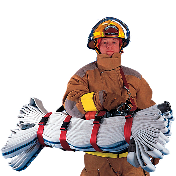 Features include: an updated shoulder strap, which is adjustable and removable. The shoulder strap is long enough that a firefighter can carry the bundle across the body for better balance. Two firefighters can also carry The Hose Vice. Handles have been incorporated into the ends of the four straps. Two firefighters simply utilize these handles.