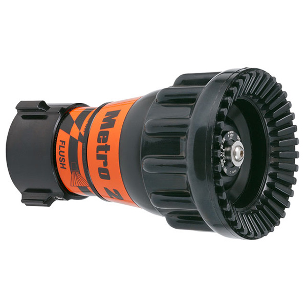 Fixed flow tip with 10 flow and pressure choices. The METRO 2 includes a flush without shutting down, molded rubber teeth for full-fill “power fog” pattern. Lightweight hardcoat anodized aluminum for maximum resistance to corrosion and wear. Tip does not shut off and must be used with a separate valve or valved playpipe. 1.5″ (38mm) rigid rocker lug coupling is standard.