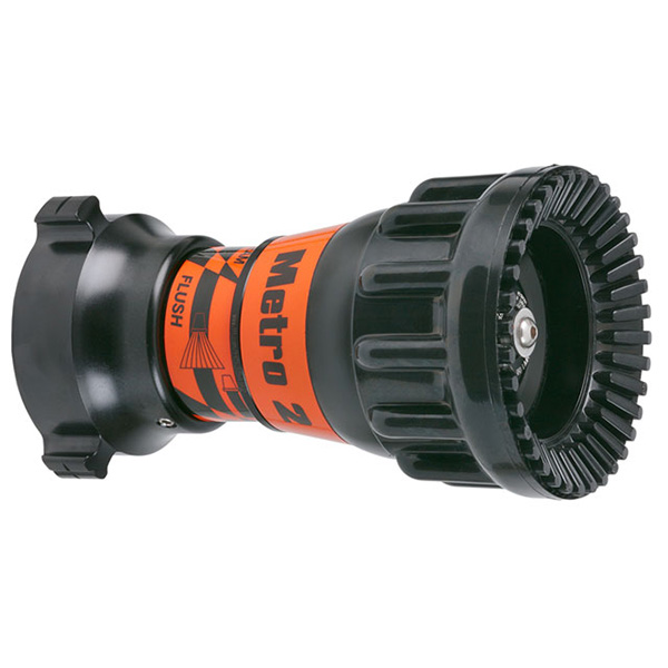 Fixed flow tip with 10 flow and pressure choices. The METRO 2 includes a flush without shutting down, molded rubber teeth for full-fill “power fog” pattern. Lightweight hardcoat anodized aluminum for maximum resistance to corrosion and wear. Tip does not shut off and must be used with a separate valve or valved playpipe. 2.5″(65mm) rigid rocker lug coupling is standard.