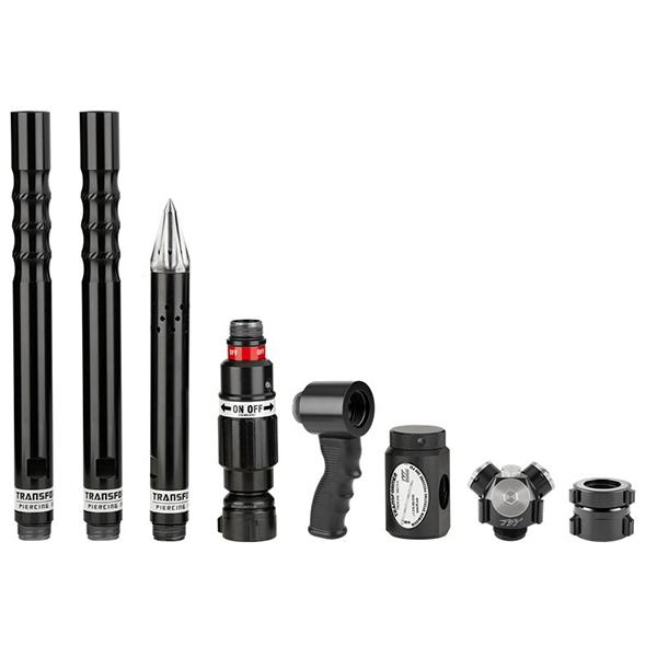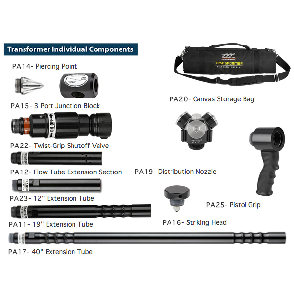 The Transformer Plus Piercing Nozzle System features a hardened point, aluminum and stainless distribution nozzle, all extension tubes pistol grip and valve are constructed of hard coated extruded aluminum, and includes a sturdy nylon carrying bag with compartments for each component.