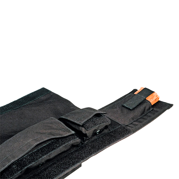 Cover flap with hook and loop closure protects the two exterior pockets for tools and spare parts, and over-size leather guards help keep the dogs in.
