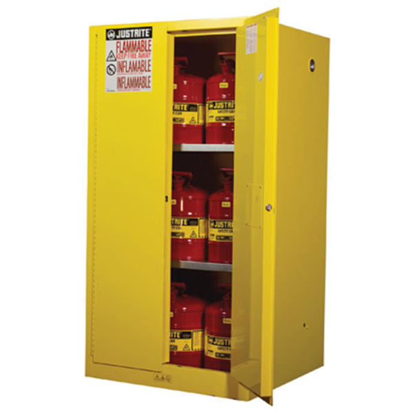 Patented SpillSlope® galvanized steel shelves direct spills to back and bottom of a leakproof 2” (51-mm) bottom sump. They adjust on 3” (76-mm) centers for versatile storage. Cabinets also feature dual vents with flame arresters, four adjustable self-leveling feet, grounding connector, and trilingual warning label. Durable lead-free epoxy/polyester powder-coat finish provides excellent chemical resistance.
