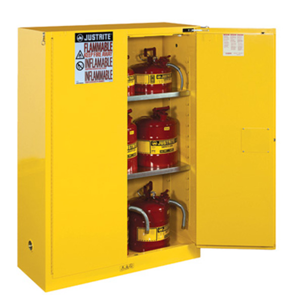 Patented SpillSlope® galvanized steel shelves direct spills to back and bottom of a leakproof 2” (51-mm) bottom sump. They adjust on 3” (76-mm) centers for versatile storage. Cabinets also feature dual vents with flame arresters, four adjustable self-leveling feet, grounding connector, and trilingual warning label. Durable lead-free epoxy/polyester powder-coat finish provides excellent chemical resistance.