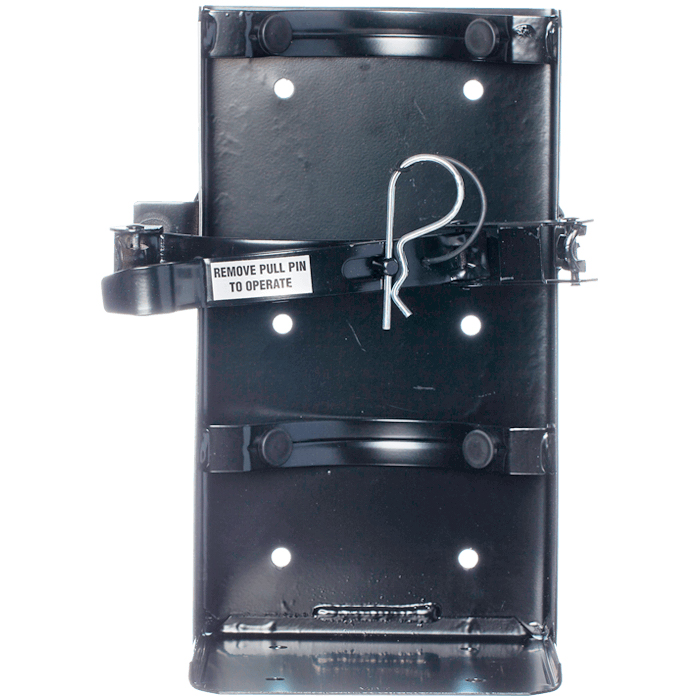 The catch pin is secured to the bracket with a black rubber tether. Pin must be pulled prior to extinguisher removal.